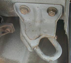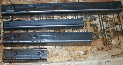 | I decided to build my own receiver-like hitch mount. Here is a picture of the underside of my car near the driver's side bumper. Note the bolts holding the tow point. I decided that I could attach to this point by removing the bolts and replacing them with long bolts that went through some pieces of square steel tubing. One piece of tubing would act as a spacer to lower the receiver just below the bumper. Because I don't have a welder, I came up with a design that could be bolted together. Again, the mill at work came in handy. Here is a picture of the milled and drilled pieces before assembly. Another trip to Alan Steel in Redwood City provided me with the steel; 1-1/2" square stock and 1" square stock. Both with 1/8" wall thickness...heavy duty stuff. |